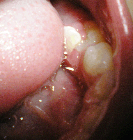 Odontomas that have erupted into the oral cavity are rare, with the majority of odontomas being intraosseous. Erupted odontomas have been detected in all age groups. Hence the mechanism behind the eruption of the odontoma remains uncertain. It appears that this mechanism is different from tooth eruption because of the lack of the periodontal ligament in odontomas [8] [9]. Bone remodeling of the jaws resulting probably from the presence of dental follicles has been suggested to cause the eruption of odontomas in younger individuals [9]. It has been reported that most of the cases of erupted odontomas were associated with unerupted teeth, especially second molars, leading to the postulation that the eruptive force of the unerupted teeth could contribute significantly in causing odontomas to erupt [7]. In the present case it appeared that the eruption of the deciduous mandibular left second molar had contributed to the transmucosal eruption of the odontoma partially overlying it. The small size of the odontoma and its location coronal to the primary second molar seem to have favored its eruption into the oral cavity.