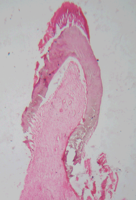 The fragment was removed under local anesthesia, fixed in formalin and submitted for histopathological study. Macroscopically, the hard tissue specimen was yellowish white in color and hard in consistency and measured 0.9x0.6 cm in dimension.