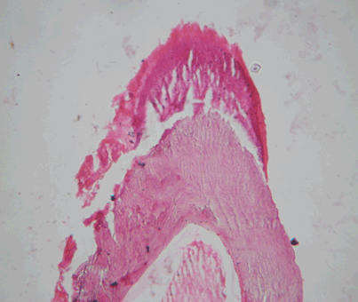 Figure 4: Decalcified section showing enamel matrix, dentinal tubules (H&E stain, x40).