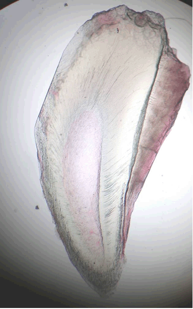 Figure 5: Ground section showing enamel, dentin, dentino-enamel junction and a thin layer of cementum at the periphery.