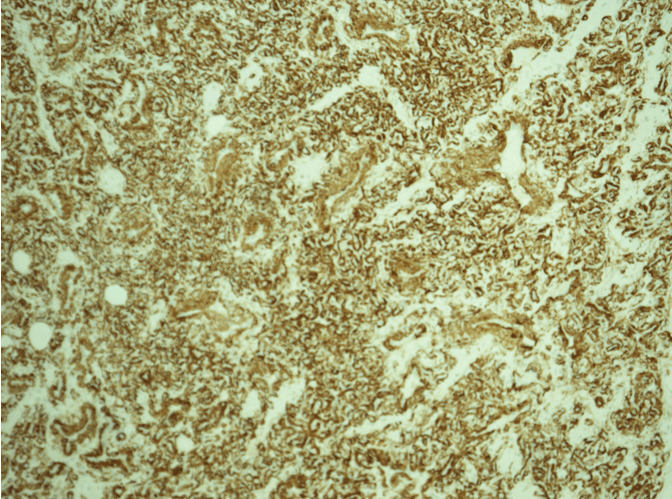 Figure 2: Positive smooth muscle actin stain of tumor cells.