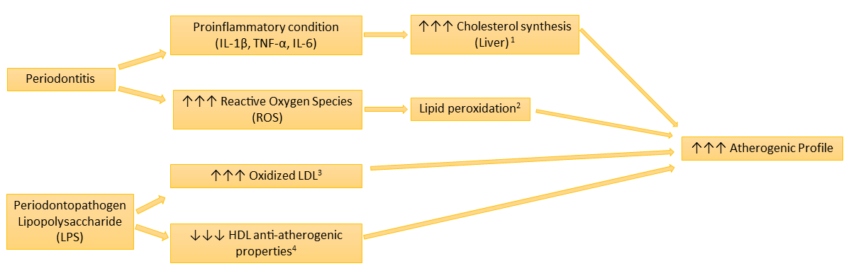The PAROKRANK study, a recent large case-control study of periodontitis, verified by radiographic bone loss and with a careful consideration of potential confounders, concluded that the risk of a first myocardial infarction was significantly increased in patients with periodontitis even after adjustment for confounding factors (odds ratio, 1.28; 95% CI 1.03–1.60) [18]. Although there is a majority of observational studies that strengthen this association, not all of them support it. There is a fairly robust evidence that the pathogenic mechanism is due to an increased risk of endothelial dysfunction in patients with chronic periodontitis and subsequent development of atherosclerotic vascular disease [19]. In this sense, in chronic periodontitis, there is a clear increase in the atherogenic profile (Figure 1). To date, there are no intervention studies, based on periodontal treatment, that provide a clear evidence of a repercussion in cardio-cerebrovascular events. Further investigations with larger sample sizes and with longer follow-up periods are required to confirm a causal relation. Nevertheless, there is moderate evidence of improvement in indirect markers of cardiovascular disease, such as endothelial function and biomarkers of systemic inflammation, after periodontal treatment [20]. | ||||||