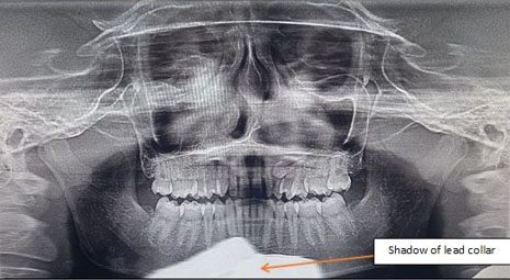 On her previous visit to a local clinic, she was prescribed a panoramic radiograph, which she carried with herself. A panoramic radiograph presents a tenfold reduction in the amount of radiation exposure and limits the dose absorbed by the patient compared to periapical radiography. For pregnant women, since the intrauterine dose absorbed is less than 10-6 rad, the risk of mental abnormalities due to dental radiology is considered nonexistent. Since patient was in the third trimester of pregnancy and active immediate intervention was not planned, computed tomography (CT) was not recommended till a later date.