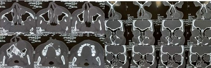 The patient was in the third trimester; therefore, surgery was planned for a later date. Pre-operative CT scan revealed a well-defined unilocular expansile non-homogenous hypodense area with a well-defined corticated border extending from the periapical region of 22–26 (anteroposteriorly) and from the alveolar bone to the maxillary sinus (superoinferiorly). Internal architecture showed the presence of a well-defined tooth-like structure along the inferior aspect, most likely to be a horizontally impacted maxillary canine. Medial displacement of the lateral nasal wall was noted on the left side. Superior displacement of floor of maxillary sinus was noted on left side, causing reduction in sinus volume of left maxillary sinus. Displacement of buccal cortical plate was noted in relation to the lesion suggestive of cortical expansion. Some areas of discontinuity were noted in the buccal cortical plate suggestive of perforation. There was no evidence of external root resorption with maxillary left canine and premolars. Computed tomography examination gave a clearer picture of the extent of the lesion for appropriate surgical planning (Figure 3).