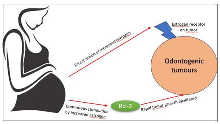 Introduction: Pregnancy is a delicate physiologic state accompanied by increased risk of pathologic exposure. Oral complications like gingival enlargements, epulis, etc. are commonly seen in pregnant women owing to immune and hormonal changes. Although very few cases of odontogenic tumors have been reported, many authors have reported major estrogen-dependent tumors presumed to arise due to differences in genetic expression. Similarly, the influence of hormones in the growth of odontogenic tumors is also postulated. The correlation of certain proteins and receptors is being reviewed to understand the pathophysiology of potential interactions between hormones and odontogenic tumor cells. The literature search was conducted with the aim to derive a vivid explanation by identifying a common component between pregnancy and the occurrence of head and neck tumors.